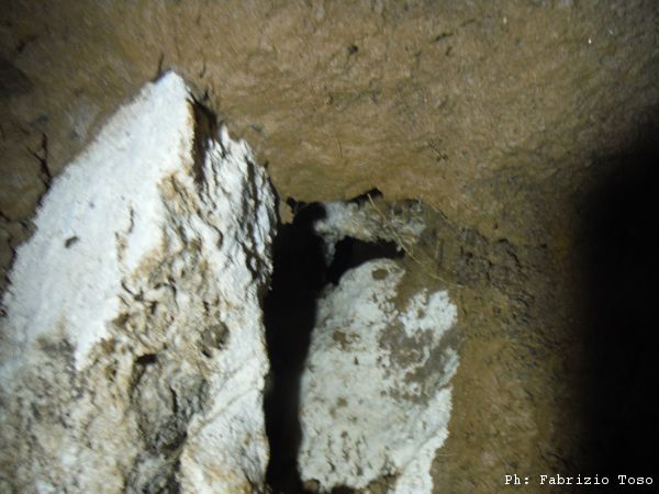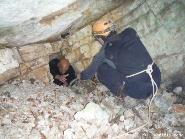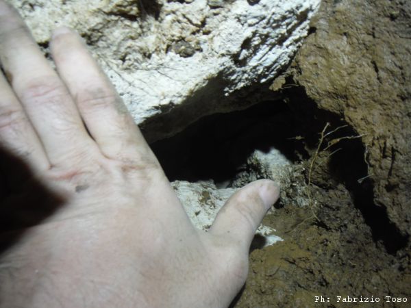 Giuseppe scava accanitamente per quasi un’ora, dopo riesce ad infilarsi di testa nel buco. Gli cedo la fotocamera per “vedere” anche io cosa c’e’. Il buco si inoltra orizzontalmente per un metro circa.