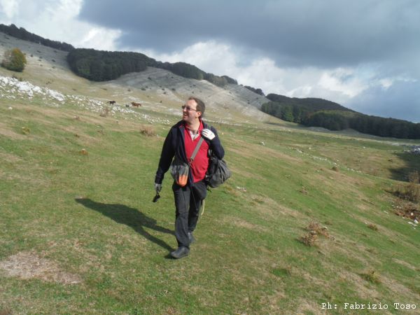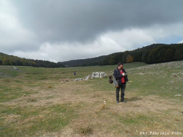 Siamo a poche decine di metri dalla macchina quando vediamo arrivare quella di Nerone. Gli urliamo dei saluti mentre parcheggia e si avvia deciso verso il centro della piana. Si ferma ad uno dei primi buchi visti stamane. Lo raggiungiamo la’.