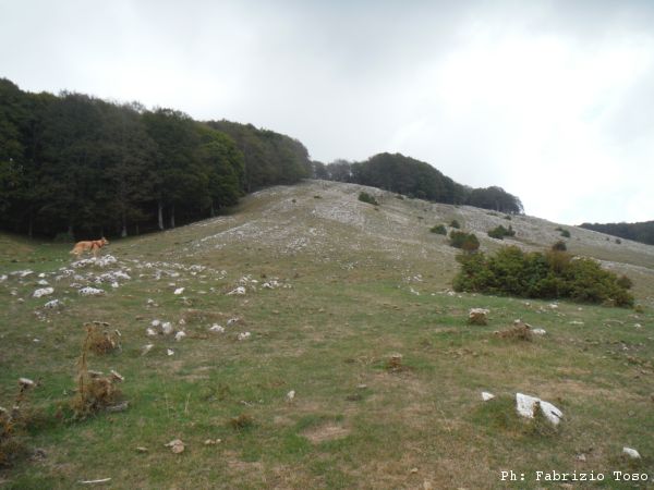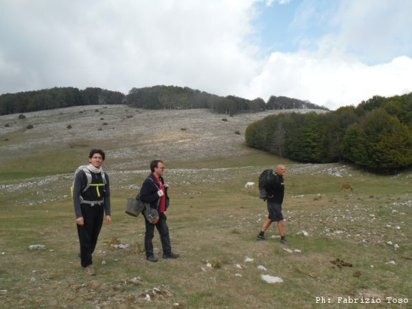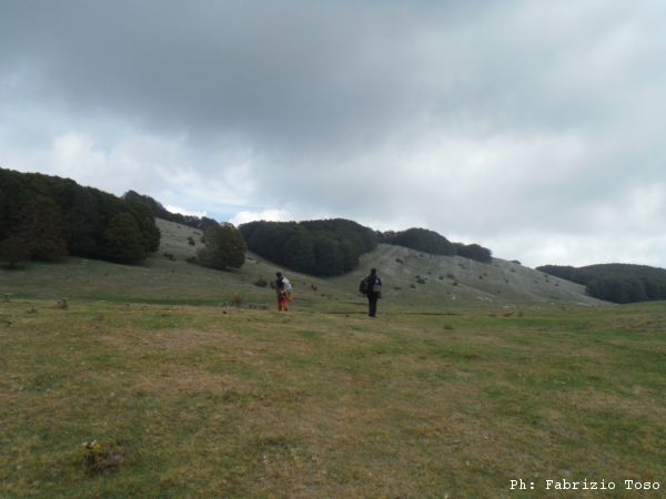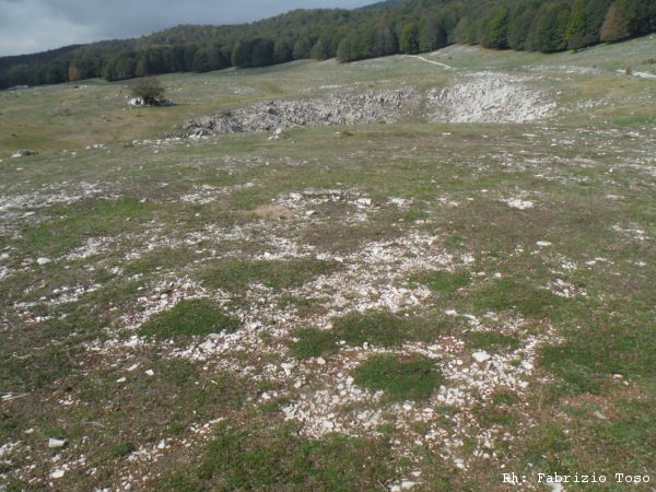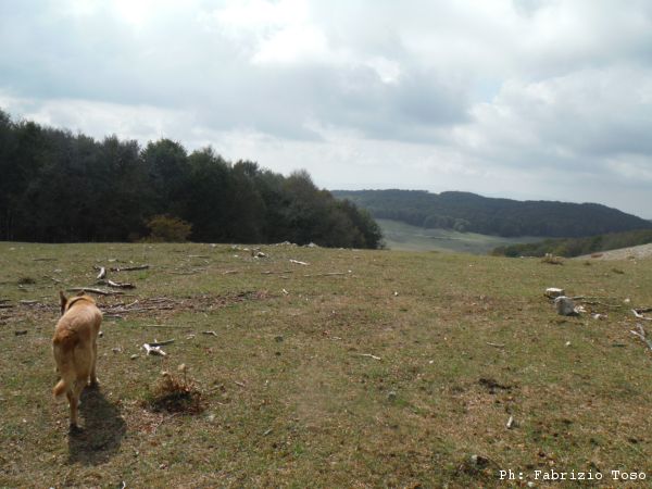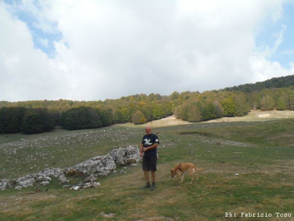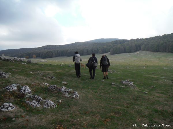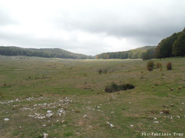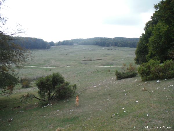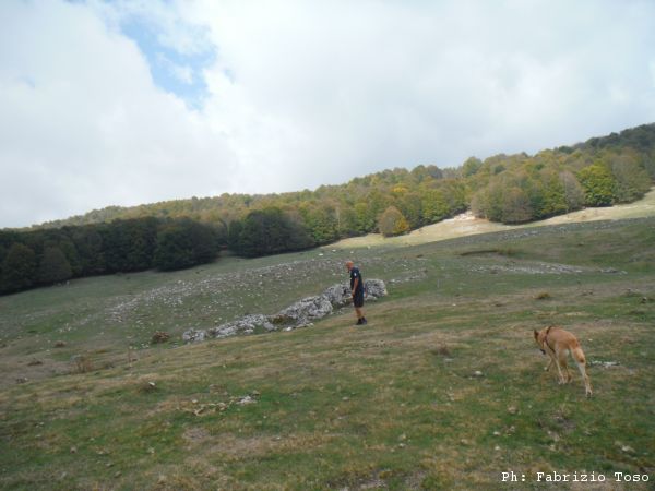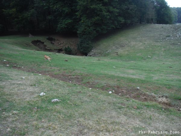 Proseguiamo verso il fondo della piana. Anche la si vede una interessante dolina. Giuseppe ed io seguiamo Luna verso quel punto, Gabriele si distacca e prosegue verso la nostra destra.