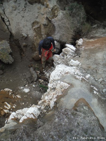 La discesa di Giuseppe ci rivela che e’ abbastanza semplice arrivare alla base. Si puo’ scendere e salire anche senza corda. Nerone lo segue subito. Io aspetto pazientemente almeno una decina di secondi poi scendo anche io. Lo sgrottamento in cui ci infiliamo termina in un buco appena percorribile.