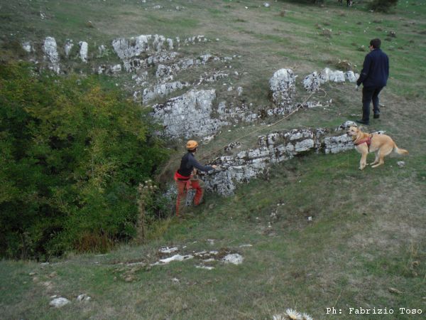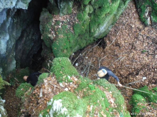 Torniamo alla dolina con albero. Come al solito e’ Giuseppe il prescelto per la discesa esplorativa. Vorrei fare il bravo ed aspettare gli esiti della sua visita ma la mia curiosita’ pero’ e’ troppa, mi raccomando con Luna di fare la buona e scendo anche io.