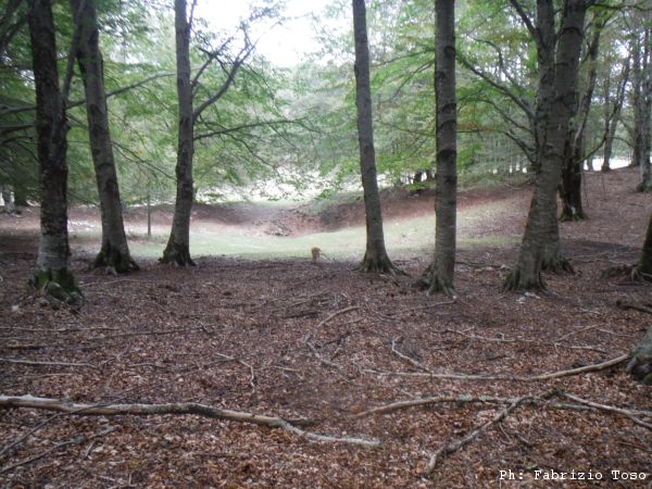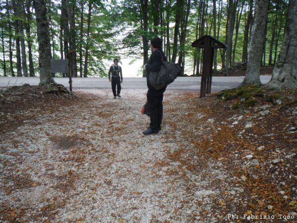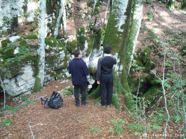 Finita la perlustrazione della dolina ci troviamo a decidere dove proseguire con la nostra passeggiata. Vicino a noi parte un sentiero, Gabriele aveva accennato al fatto che seguendolo avremmo trovato un’altra grotta. Giuseppe ed io decidiamo di essere interessati e di prendere il sentiero. Ci manca solo Gabriele. Iniziamo ad urlare il suo nome come ossessi per chiamarlo a noi. Dopo un paio di minuti di urla proviamo con il cellulare. Non siamo fortunati, qua non c’e’ campo. Un paio di secondi di titubanza ce li concediamo ma poi prendiamo per il sentiero e continuiamo il giro. Il sentiero si inoltra nel bosco e va pure in salita. Dopo il primo tratto arriviamo a valicare, Giuseppe decide di aver sudato abbastanza e si sveste della tuta speleo.