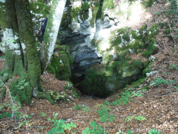 Quando il sentiero prende a destra verso un’area pic-nic, Nerone taglia per il bosco verso sinistra. Ancora pochi passi e siamo di fronte alla grotta.