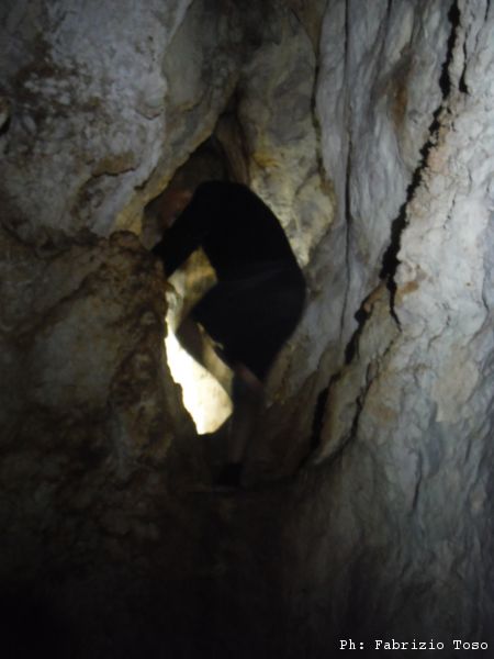 Che devo fare? Sono curioso! Pochi minuti di attesa esauriscono la mia pazienza, scendo anche io. Trovo i miei amici infilati in un buco leggermente sopraelevato, dove mi dicono inizia un breve meandro. Gironzolo un poco a vedere qualche punto ma senza trovare nulla di entusiasmante. Saluto e riprendo per l’uscita.