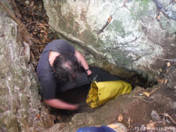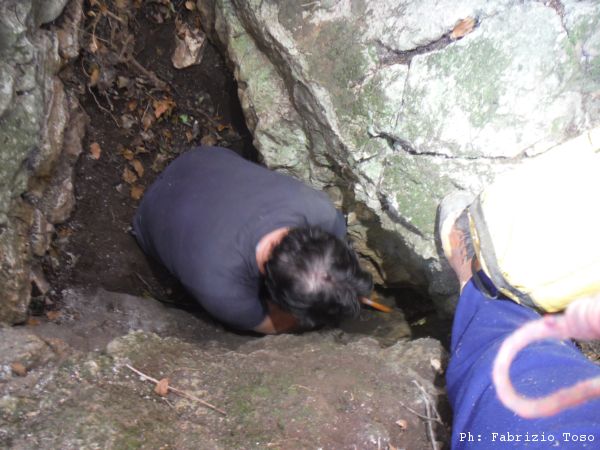 Saliamo un piccolo dislivello e passiamo accanto ad una casupola diroccata, casa Scipioni. Mentre ci cambiavamo e’ passata una vecchina con cui abbiamo scambiato qualche parola. Da quanto ho capito chiedere di “Scipioni” da queste parti, serve a poco, a quanto ci dice sono tutti Scipioni nei dintorni! Comunque, una volta superata la casetta si prosegue per un sentiero che costeggia un folto mucchio di fichi d’india colmi di frutti piu’ che maturi. All’altezza del retro della casa Gianni si dirige decisamente verso di essa. Si ferma vicino al muro della casa ed inizia a pulire il passaggio ingombro di rami e spini. Dopo la pulizia riesce finalmente a mostrarmi la possibile grotta.