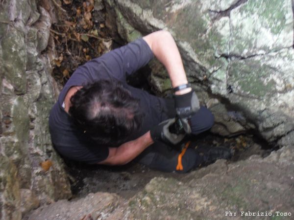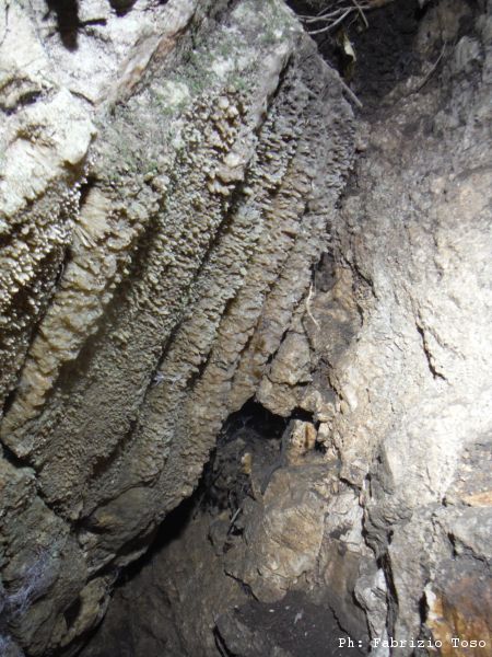 Dopo questo intermezzo di fratellanza animale Gianni decide che e’ l’ora di riposare e mi cede l’onore. Il posto e’ stretto e ho visto Gianni uscirne con i gomiti che sembrano una tartare, quindi per prima cosa fotografo il simpatico strato di concrezione che adorna le pareti laterali e quindi mi adopro nel fare spazio sacrificandone una, piccola, parte. Dopo essermi dato una sonora martellata su una mano decido di aver fatto abbastanza spazio e di passare allo scavo vero e proprio. Riempio con buona lena una decina di zaini di terriccio e sassi fino a che la stanchezza non prevale sulla curiosita’. Il richiamo di Gianni all’ora di pranzo ed alle fettuccine mette fine a qualsiasi altro pensiero. Nonostante lo spazio aggiuntivo che mi sono ricavato, non riesco a salvarmi del tutto, un gomito lo salvo ma l’altro ne esce provato e sanguinante.