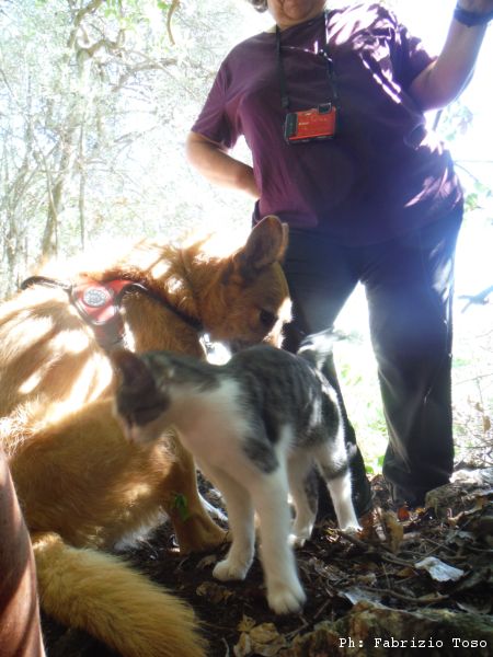 Miciomao e’ intraprendente, dopo aver soffiato a Luna un paio di volte alla fine la giudica inoffensiva e si avvicina. Arriva addirittura a strofinarcisi contro facendo le fusa.