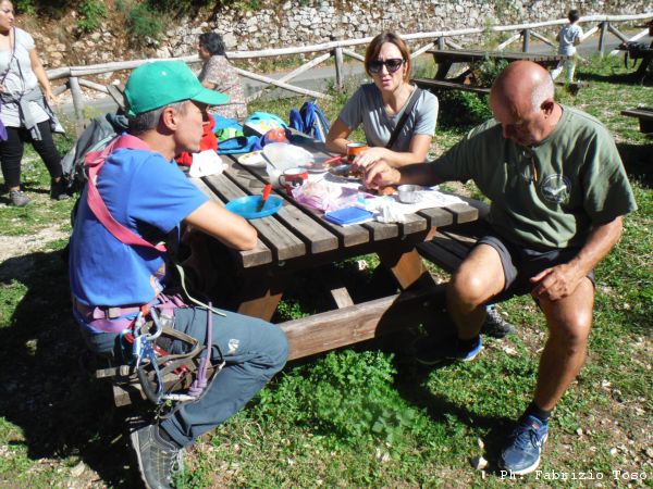 Il resto della mattina corre via svelto. Il nostro Claudione arriva con tutta la famiglia e, senza perder tempo, inizia a preparare la brace ed a cucinare le cose buone che ha portato. Nel frattempo noi giocherelloni continuiamo a fare vari esercizi sulle corde disponibili provando manovre ed anche simulando di avere un allievo su corda e di dovergli spiegare cosa fare. Quando Claudione annuncia che il pranzo e’ pronto, migriamo in massa verso l’area picnic radunandoci in gruppetti che chiacchierano di cose varie, il piu’ delle volte su temi speleologici. Le chiacchiere sono interrotte solo da rapide incursioni al braciere per rifornirsi.