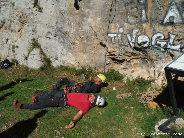 La manovra serve per portare a terra uno speleo svenuto durante la risalita su corda. E’ tecnicamente complessa e deve essere eseguita in pochi minuti se si vogliono evitare gravi complicazioni per l’infortunato. Questa manovra inoltre costringe a posizioni scomode e a volte letteralmente dolorose, quindi puo’ distruggere sia il “malconcio” (come direbbe Nerone) che il soccorritore. Ecco Massimiliano e Claudio accasciati a terra dopo aver terminato con successo l’esecuzione della terribile manovra.