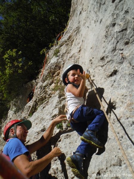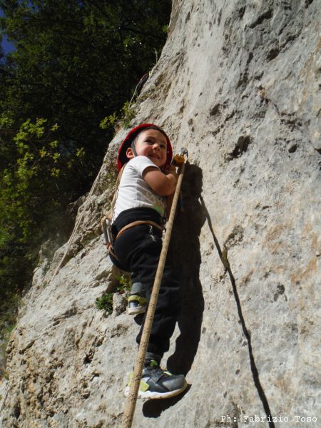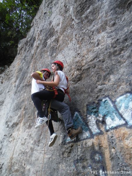 E’ arrivato il momento delle nuove leve. Sistemiamo una corda con la carrucola per aiutarli nella arrampicata. Il primo a cimentarsi e’ Tiziano, oramai un veterano.