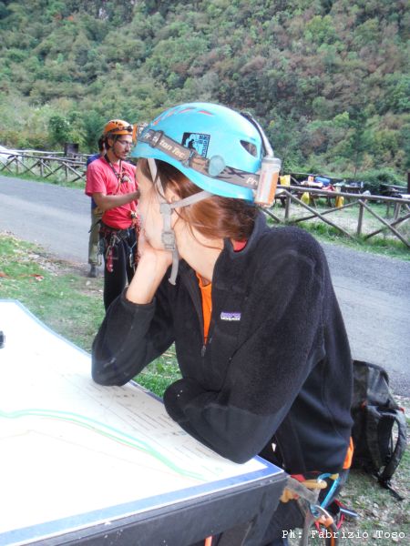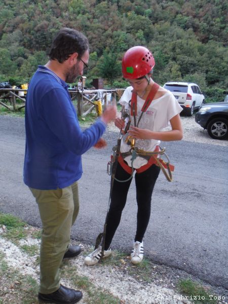 Gabriele, altro socio, nonche’ segretario dello SZS mentre impartisce ad Irene, da poco iscritta al gruppo, alcune nozioni base sull’utilizzo della attrezzatura speleo.