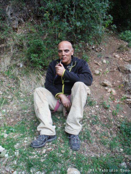 Mentre mi cambio, vedo Gabriele e Giuseppe riprendere la macchina per andare a recuperare Giancarlo. Metto svelto l’imbrago e poi torno presso la parete, stiamo per iniziare. Maurizio non si e’ ancora messo il casco quindi di protegge come puo’.