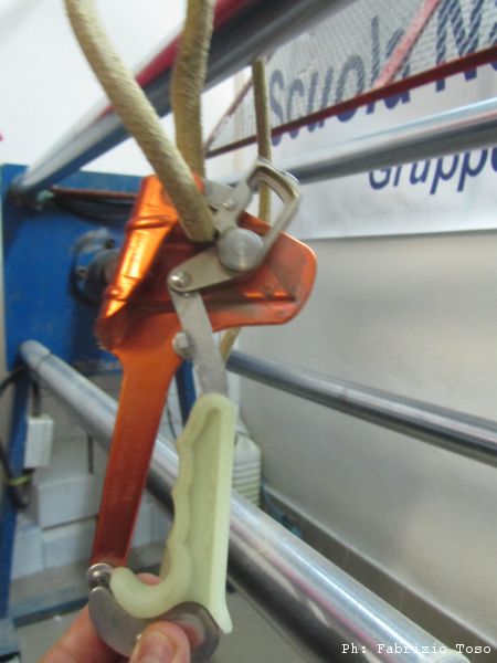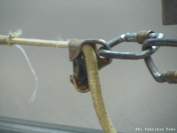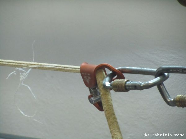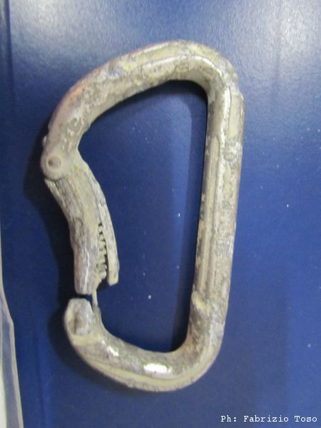 Mentre siamo tutti in attesa che la corda si rompa, il croll cede e spara via il cricchetto, per fortuna senza danni per nessuno. E’ uno dei croll che utilizzano da anni nelle prove dinamiche alla torre di caduta, aveva gia’ subito troppi stress e stavolta non ce l’ha fatta.