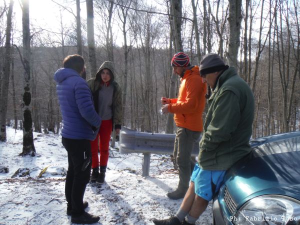 Erminio, in giacca a vento arancione, e’ il terzo del gruppo. Dopo i saluti di rito andiamo alle macchine per fare quattro chiacchiere pre-festive.