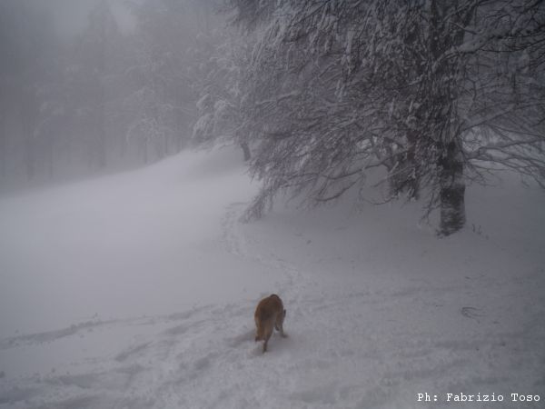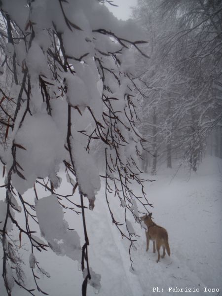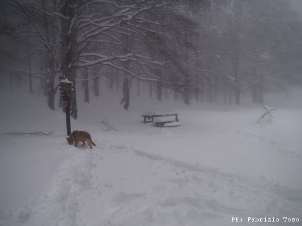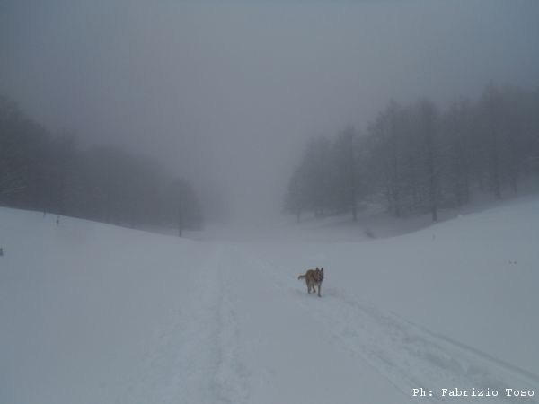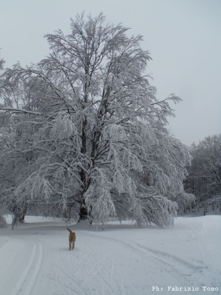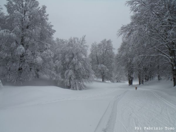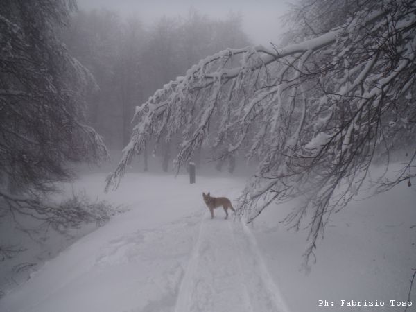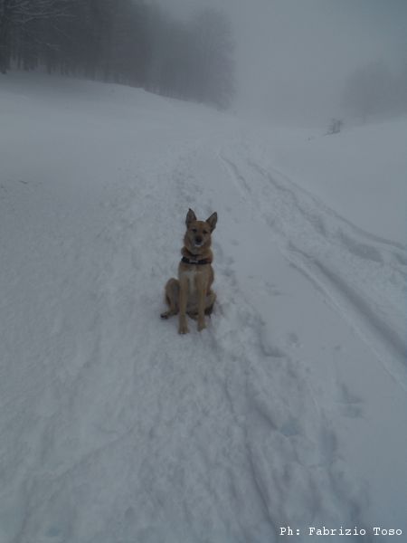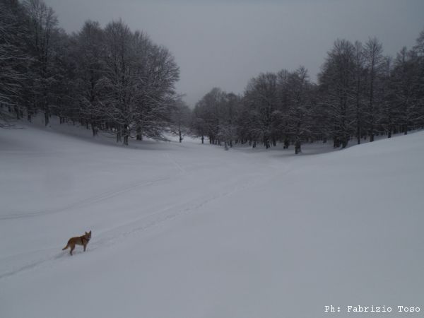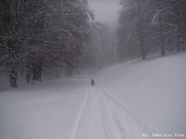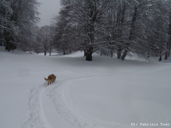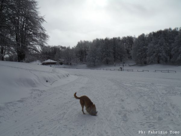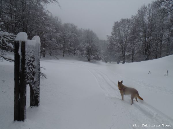 Partiamo dal parcheggio di Campo dell’Osso avviandoci lungo la pista da sci di fondo. Dopo nemmeno un centinaio di metri una ampia curva ci porta dentro il bosco. Luna e’ affascinata dalla neve e dagli odori strani che nasconde.