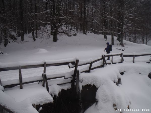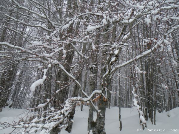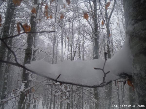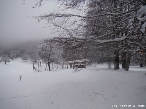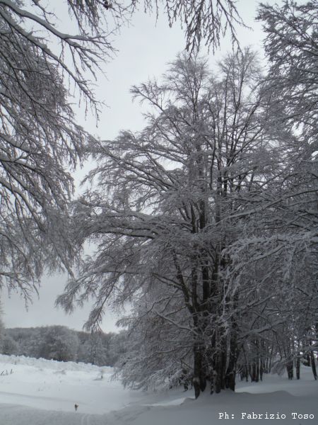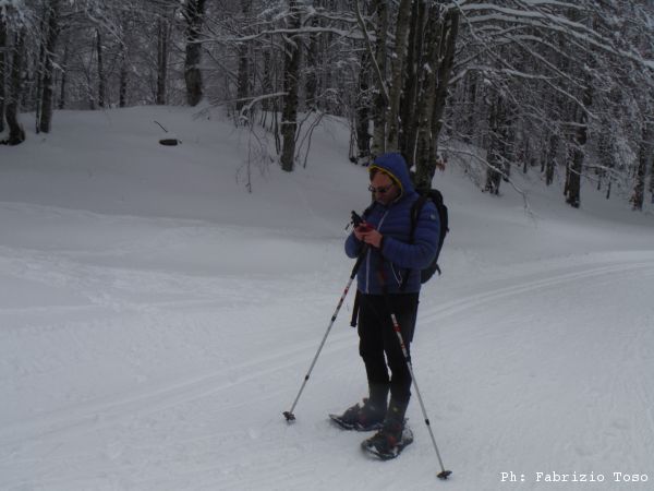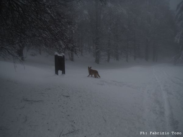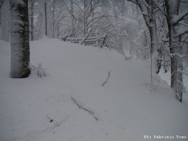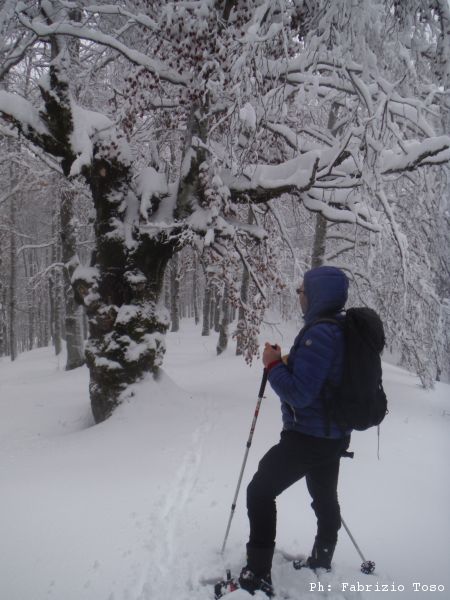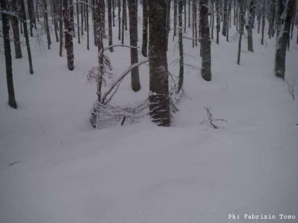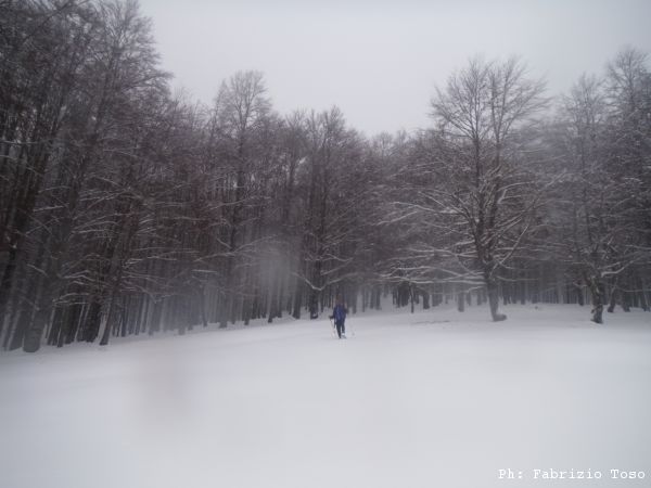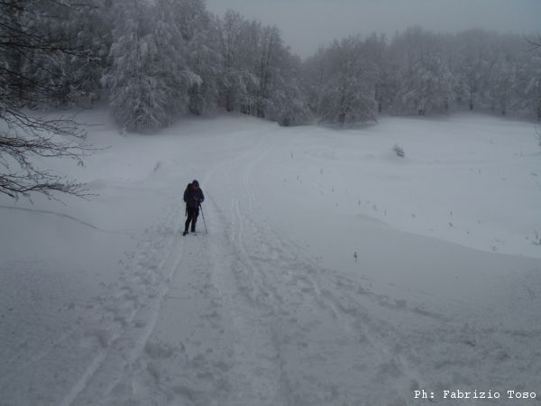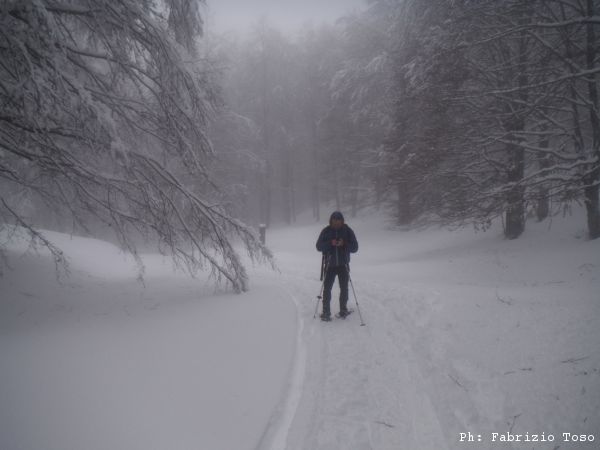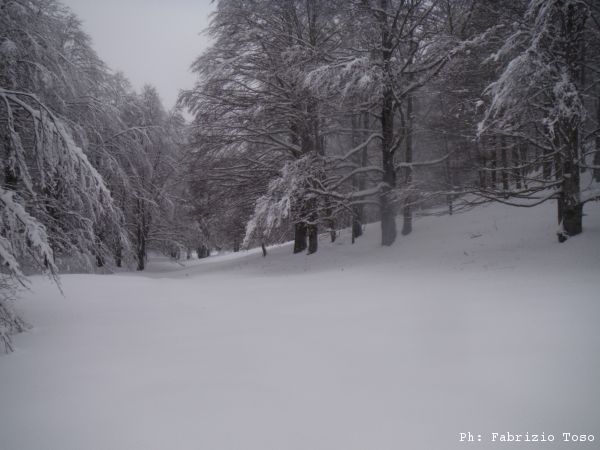 Partiamo dal parcheggio di Campo dell’Osso avviandoci lungo la pista da sci di fondo. Dopo nemmeno un centinaio di metri una ampia curva ci porta dentro il bosco. Luna e’ affascinata dalla neve e dagli odori strani che nasconde.