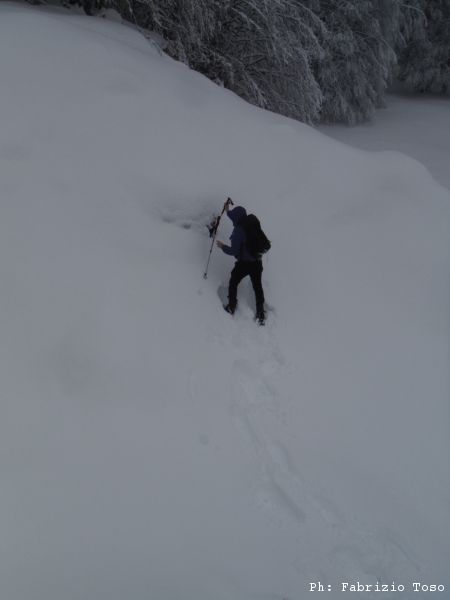 Si, e’ il caso di ritornare. Giriamo i tacchi, quelli delle ciaspole, e ripercorriamo a ritroso la strada appena fatta.