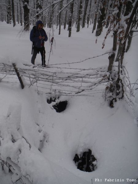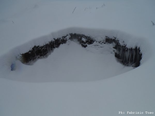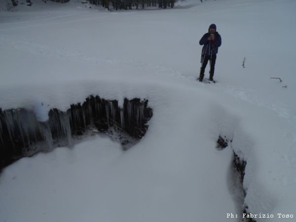 Visto che lo scopo portante di tutto questo ciaspolare e’ la ricerca di nuovi buchi che possano trasformarsi in grotte, appena ne adocchiamo uno, subito parte la deviazione per un doveroso controllo.