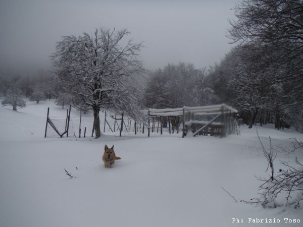 Approfittando di dover smaltire qualche caloria delle innumerevoli accumulate durante le feste di Natale, Gabriele ed io decidiamo di approfittare delle abbondanti nevicate dei giorni scorsi per una ricognizione in ciaspole dalle parti di Campo dell’Osso. Visto che quando si tratta di passeggiare per i boschi Luna e’ sempre disponibile e contenta di partecipare, anche stavolta la portiamo con noi scatenando i suoi ululati di gioia gia’ dalla porta di casa.