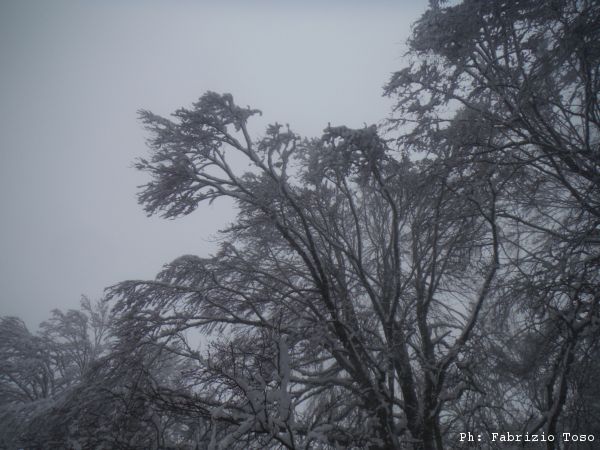 Con il calare di una leggera foschia il paesaggio sembra sempre piu’ irreale. L’unico problema e’ costituito dai pezzi di ghiaccio che ogni tanto si staccano dagli alberi. Oggi il berretto in testa non serve a proteggersi dal freddo quanto per evitare la formazione di bernoccoli.