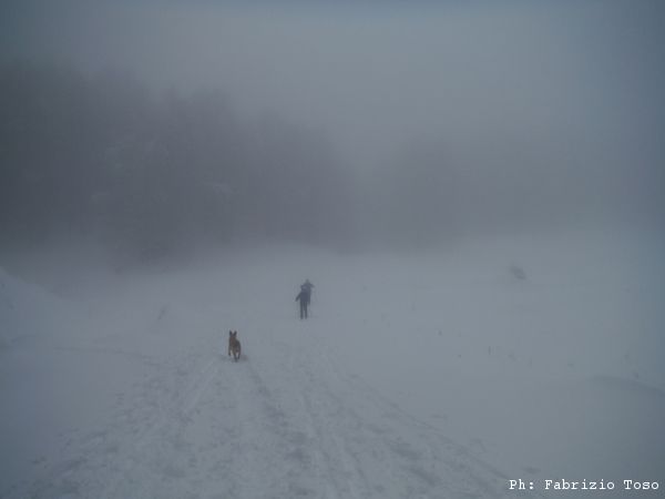 Iniziamo a tornare in zona “civile”, incontriamo altre persone, anche loro ciaspolatori. Luna, incuriosita, va loro incontro.