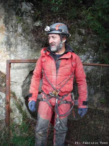Mentre facciamo colazione arriva anche il quinto ed ultimo componente del nostro gruppetto odierno, Giuseppe. Aspettiamo che anche lui si sfami poi salutiamo Giulio e ci trasferiamo alla grotta dove ci cambiamo. Fabrizio non verra’ con noi, pero’ ci accompagna solo per un supplemento di piacevole chiacchiera. Ecco Giuseppe pronto ad entrare.