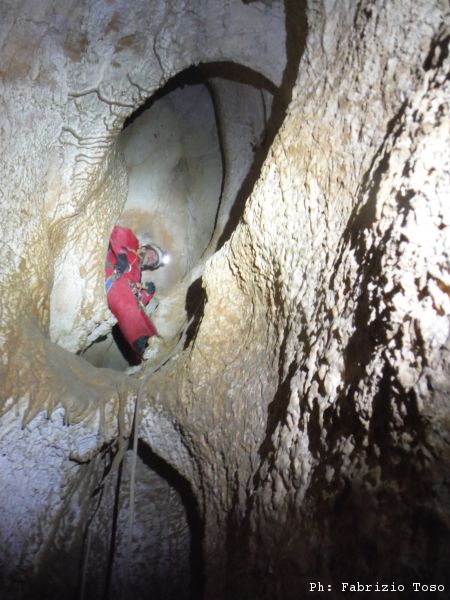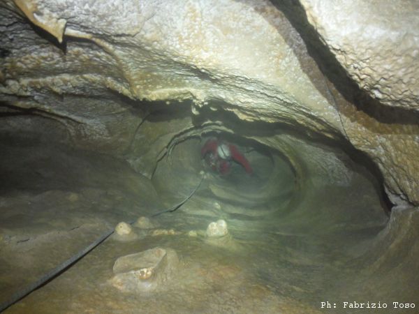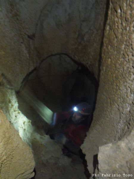 Gabriele mi raggiunge, proseguiamo verso l’uscita passando per il traverso e quindi per il pozzetto.