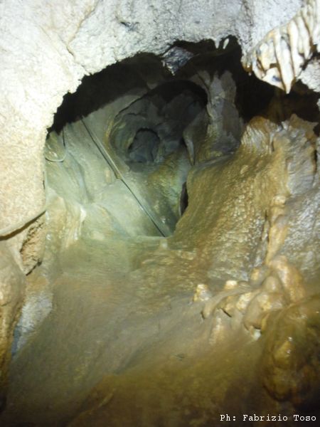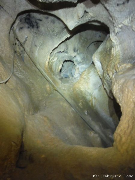 In cima al secondo toboga, il primo tornando, decido di fare un’altra deviazione. Il cunicolo che porta all’inizio del toboga, a meta’ si biforca, a destra si arriva appunto al toboga, ma a sinistra? Vado a vedere. Dopo un passaggio strisciato non troppo comodo mi ritrovo a salire quella che sembra la naturale prosecuzione del toboga. Salgo almeno di 4 metri fino ad affacciarmi ad un davanzale dove vedo partire una galleria sia a destra che a sinistra. Davanti a me quello che sembra un arrivo d’acqua.