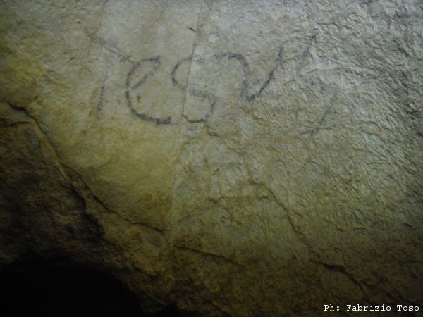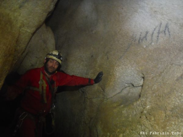Dopo aver fatto cadere giu’ alcune secchiate di terriccio e qualche sasso, me ne torno giu’. Con Gabriele prendiamo la via del ritorno. Una foto alle scritte sulla parete non poteva mancare.