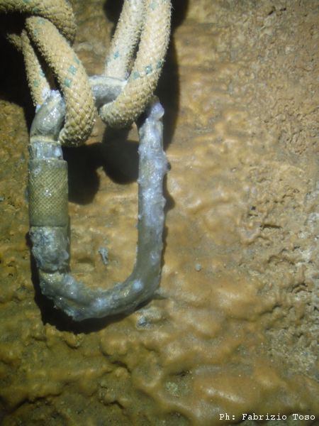 Proseguiamo scendendo il primo toboga e quindi il secondo. Dei nostri amici nessuna traccia. O meglio, nel cunicolo tra i due toboga trovo un moschettone. Sembra li’ da non molto. Potrebbe essere una traccia! Proseguiamo rapidi fino alla vela che prelude alla sala del the.