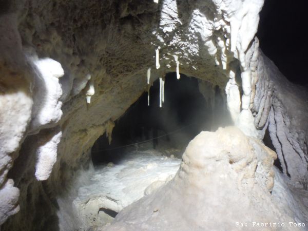 Arrivati al bivio per il ramo dell’arpa celtica dei nostri amici nessuna traccia. Proviamo ad urlare ma nessuno risponde. Nella grotta c’e’ ancora il cavo d’antenna usato per gli esperimenti “radiologici”. Magari hanno seguito il cavo. Interrompiamo il rilievo ed andiamo a cercare i nostri amici.