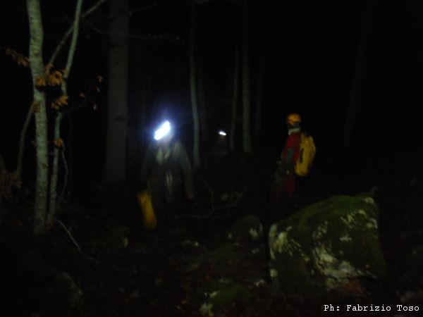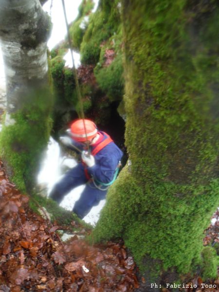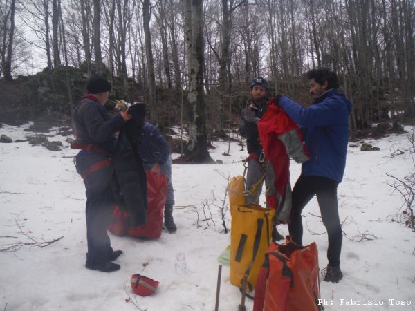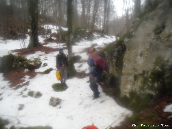 La giornata passa cosi’, tra una scavata e l’altra. A pomeriggio inoltrato Irene decide di averne abbastanza, anche a causa di un principio di congelamento alle mani, ed esce fuori a raggiungere Gabriele. Noi rimasti continuiamo nello scavo. Lasciamo la grotta senza aver trovato una prosecuzione, ma contenti di averla avuta vinta sul fastidiosissimo arco di roccia che rendeva difficoltoso l’accesso in zona scavi. Quando usciamo e’ gia’ scuro ed inizia a fare seriamente freddo.