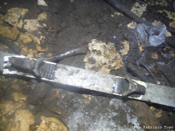 Il lavoro riprende alacremente, dentro si scava, qualcuno prende la cofana piena di terra e la aggancia alla corda che viene recuperata da Giuseppe per essere gettata dall’altra parte, verso l’ingresso. In tutto questo, decido di aprire un altro fronte di scavo dall’altro lato, in fondo al braccio sinistro della famosa “T”. Quando mi stanco faccio cambio con Irene, lei a scavare al nuovo punto, io a fare la spola per passare la cofana dagli scavatori a Giuseppe e viceversa.