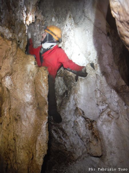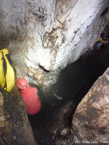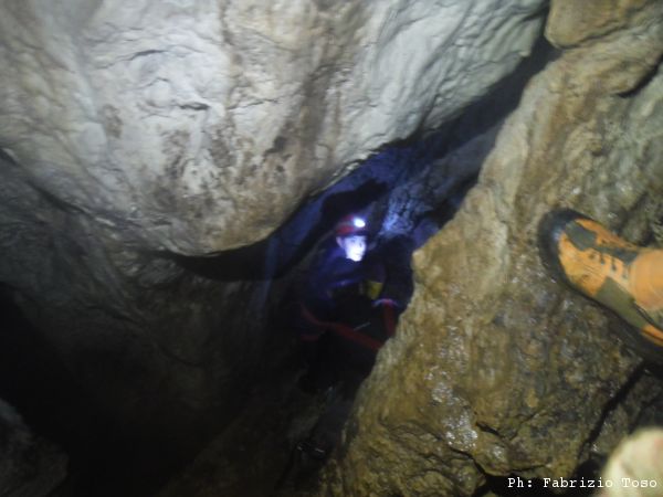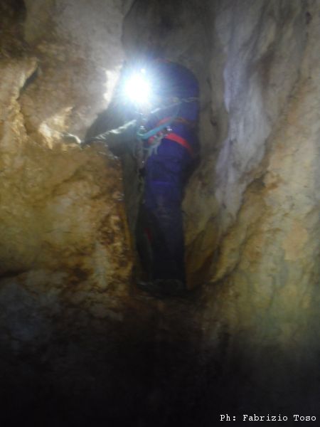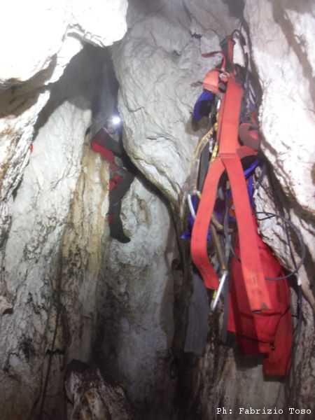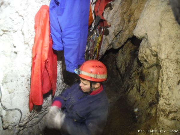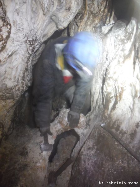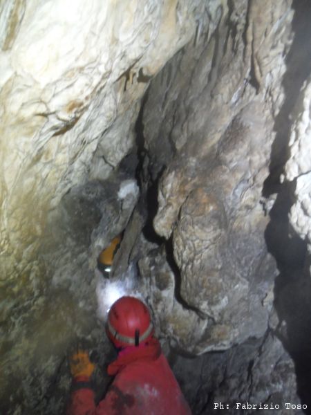 Giuseppe interrompe gli scavi, deve andare a fare una cosa per conto suo. Arrampica per passare il largo diaframma che ci separa dallo sgrottamento principale. Quando torna, stabiliamo che rimarra’ sulla cengia. Dobbiamo iniziare a portare la terra scavata di fuori e sara’ lui a farlo.