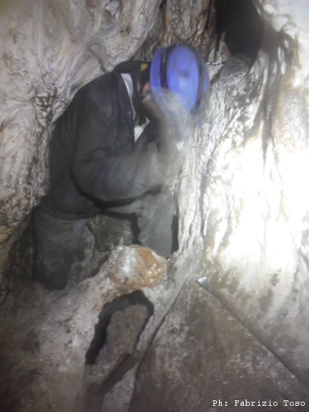 Finalmente riesco a scendere e a vedere da vicino. Gli scavatori, al momento Giuseppe e Leandro , sono dietro uno stretto pertugio a tirare fuori terra. Da questa parte ci sono Martina ed Irene a smaltire il tutto.