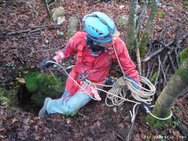 Dopo i saluti ed il trasbordo degli zaini, ci ammucchiamo tutti nella macchina di Gabriele ed andiamo. Un rapido passaggio al bar e poi dritti alla grotta. Il tempo di cambiarci sfidando il frizzante freddino e siamo pronti ad entrare. Matilde sistema una corda per lo scivolo iniziale. Oggi saranno Vins e Matilde ad armare.