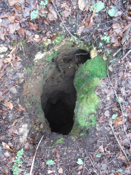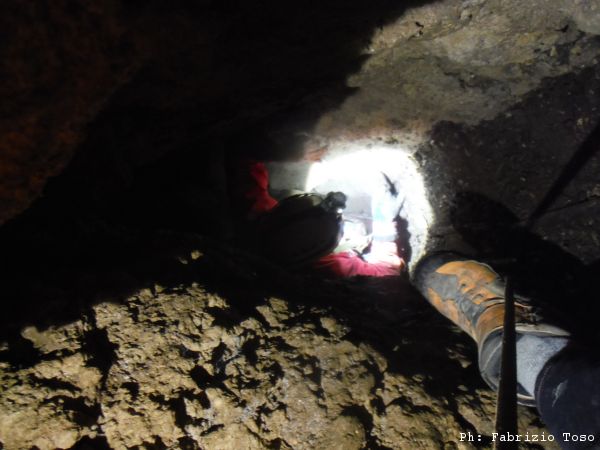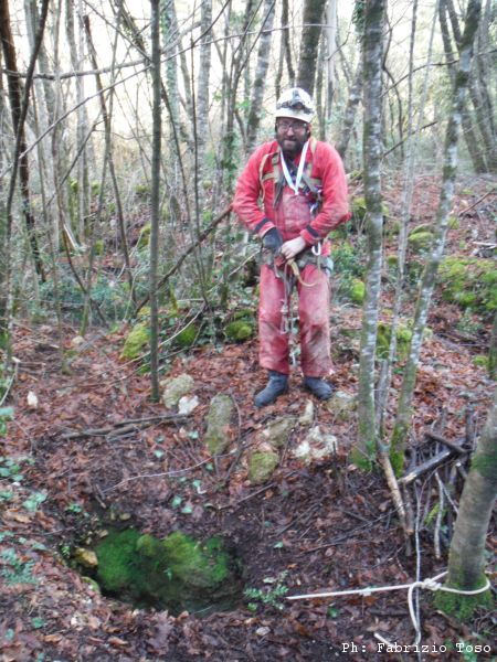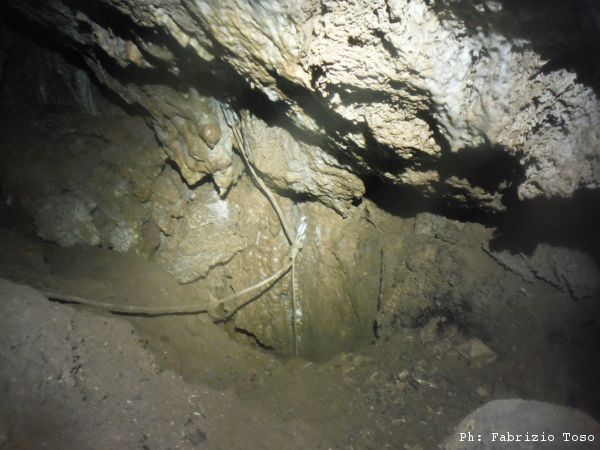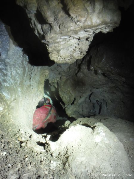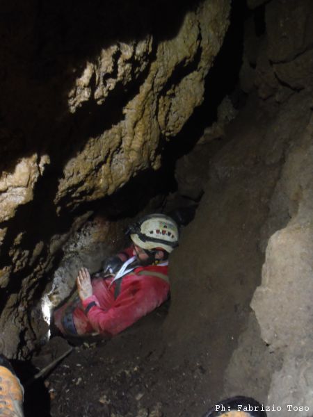 Dopo l’ingresso, verticale per circa un metro, c’e uno scivolo di terra. La prosecuzione non e’ avanti ma in corrispondenza di un buco sulla sinistra. Da come sta messo Gabriele immagino non sara’ proprio largo.