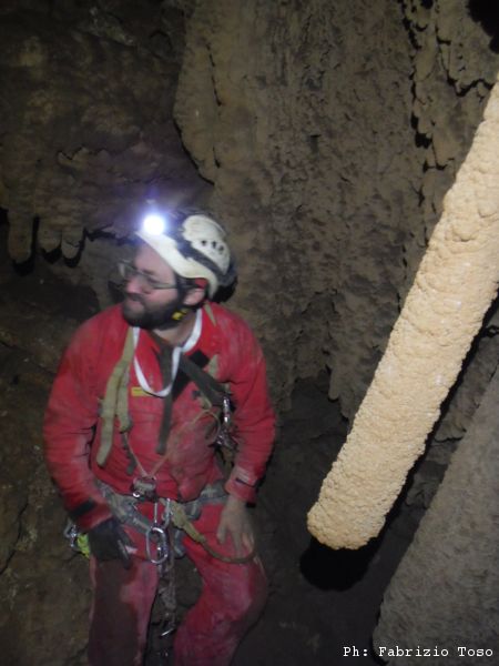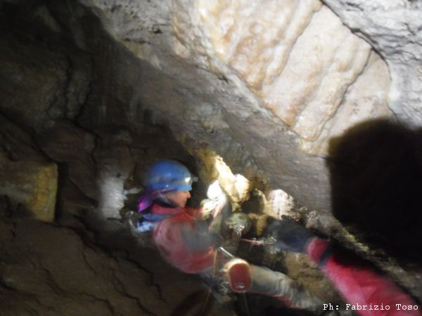 Alla fine mettiamo un fix quasi vergognoso su uno strato di concrezione. Per fortuna l’attacco singolo che c’era prima e’ con un multimonti e tiene bene. Usando tutti e 2 riusciamo ad attrezzare una partenza decente, con buona pace di Vins e Matilde che hanno sfiorato la crisi di nervi. Mentre loro scendono in avanscoperta, noi riprendiamo con calma a fare il rilievo.