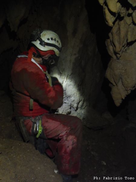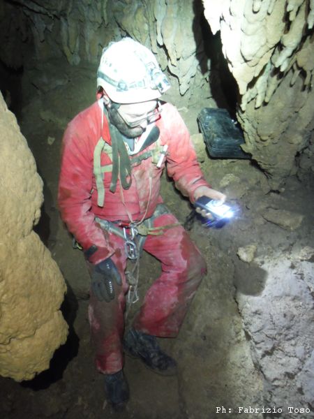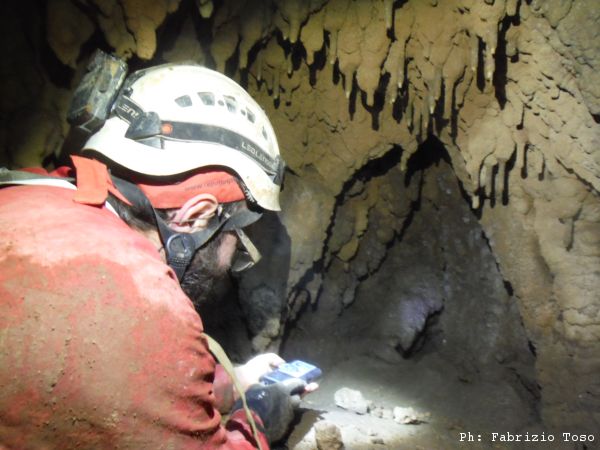 Dopo il pozzetto di circa 8 metri siamo nella frattura principale che, in corrispondenza della base del pozzo, si allarga in ambienti ampi, delle sale, direi. Gabriele oltre a dare una mano a me col rilievo, si e’ portato dietro una scomodissima valigetta con dentro dei misteriosi apparecchi. Me ne spiega un paio, uno e’ un “anemometro a filo caldo”, non chiedetemi di piu’. L’altro serve a captare e riconoscere la “voce” dei pipistrelli. Mentre sono impegnato a disegnare e sistemare il pezzo di rilievo appena fatto, lui apre la valigetta ed inizia a trafficare con tutta quella tecnologia.