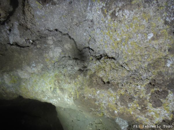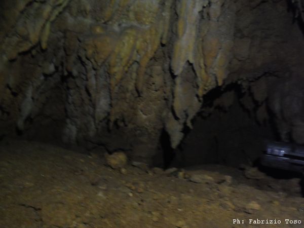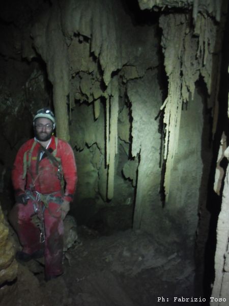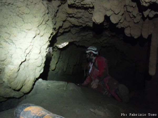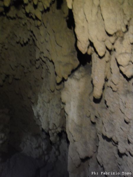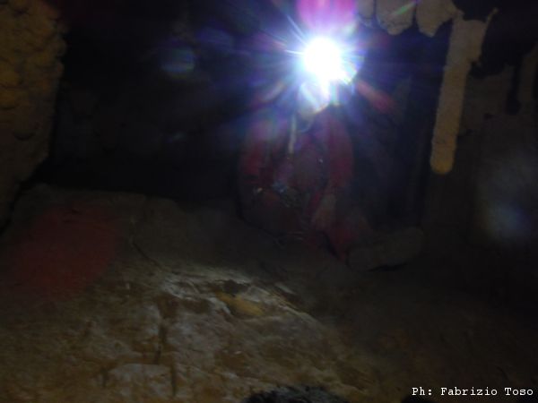 Appena sopra al pertugio “Matildeo” ci sono delle formazioni gialle. Gabriele mi intima di fotografarle ed io prontamente eseguo. Mentre lo faccio sento arrivare aria fredda dall’alto. Mi incuriosisce, cosa sara’? Mi arrampico seguendo l’aria. In effetti da questa parte la grotta prosegue ancora qualche metro. In fondo, in corrispondenza di un restringimento sento un’aria gelida venirmi addosso. E’ quasi sicuro che siamo vicino all’esterno. Dovremo tornare per vedere meglio.
