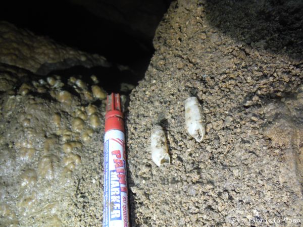 Gabriele trova 2 conchiglie per terra, dice che sono importanti, non ricordo piu’ perche’. Mi limito a fotografarle come documentazione della grotta.