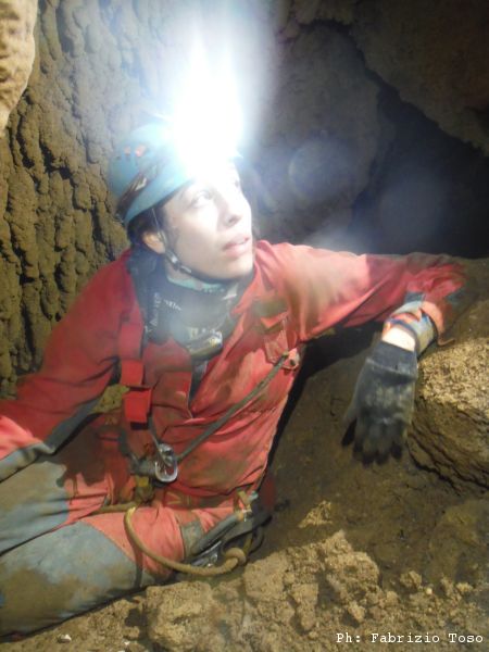 Dopo il passaggio stretto ritroviamo la nostre amiche. Siamo in una sala bassa ed inclinata, il pavimento di terra. Vins e Matilde sono vicine ad un pozzo e stanno combattendo strenuamente per doppiare l’attacco di partenza. Dico cosi’ perche’, come ci aveva anticipato Gabriele, la grotta si sviluppa nel “cardellino”, un travertino molto molto poco denso e pieno di buchi. Vins e Matilde quindi sono oramai disperate, non trovano un lembo di roccia buona dove mettere un fix!