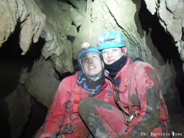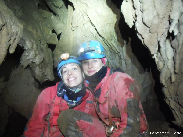 Tornando alla base del pozzo incontriamo le nostre esploratrici di ritorno. Mi sbrigo a far loro delle foto prima che scappino di nuovo via.
