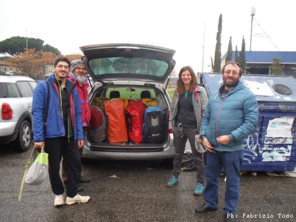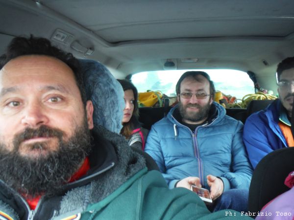 Domenica mattina inizia la lunga catena di appuntamenti che ci portera’ alla grotta. Gabriele passa a prendermi e Giuseppe ci raggiunge sotto casa mia. Da li’ ci spostiamo al bar vicino Ikea di Anagnina dove ci ritroviamo con Vincenzina e Maurizio. Fatti i conti e valutate le macchine a disposizione imbarchiamo tutto in macchina di Maurizio e ci accalchiamo dentro per fare il viaggio tutti assieme