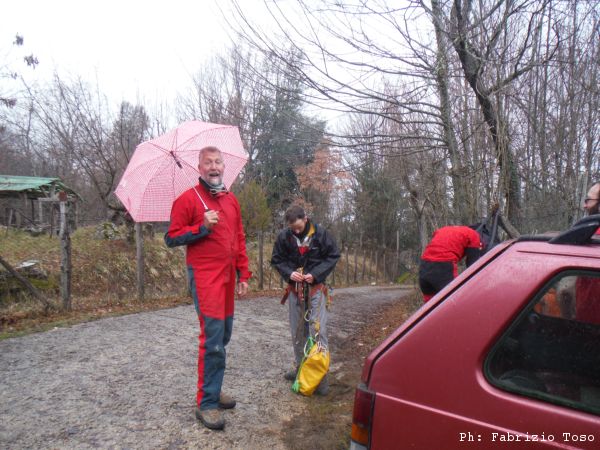Dopo un supplemento di colazione andiamo alla grotta. Non saliamo molto lungo la strada per Pian della Faggeta. Giriamo infatti quasi subito per una strada in salita. Il fatto che ci sia un cancello con l’invitante cartello “Strada Privata” non ci tange, se Vincenzone, alla guida della sua Panda, ha preso questa strada, si vede che si puo’. Arrivati ad uno spiazzo delimitato da recinzioni e 2 cancelli di ingresso a 2 diversi terreni, il buon Vincenzone si ferma e parcheggia. Nello spiazzo troviamo gia’ una macchina, e’ quella del proprietario del terreno di destra che si avvicina incuriosito. Iniziando i nostri rituali di vestizione scambiamo qualche chiacchiera con lui per informarlo che stiamo cercando una grotta nei dintorni e tranquillizzarlo sul fatto che non lasceremo le macchine nello spiazzo. Lui infatti a minuti andra’ via e le nostre macchine gli tolgono lo spazio per fare manovra. Risolviamo subito il problema, prendiamo gli zaini e portiamo le macchine piu’ giu’. Solo Vincenzone lascia la sua Panda ben accostata da un lato. Durante la vestizione, come tradizione vuole, inizia a piovere. Per fortuna non in maniera violenta, con qualche ombrello risolviamo. Infilo la tuta speleo, imprecando mentre cerco di tenere l’asta dell’ombrello incastrata tra mandibola e clavicola. Naturalmente, appena finisco di chiudere la velcro della tuta, la pioggia cessa. Una foto a Luca col suo ombrellino rosa non poteva mancare.