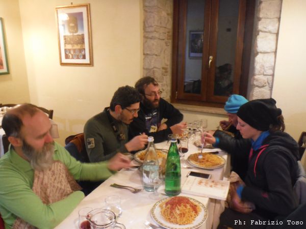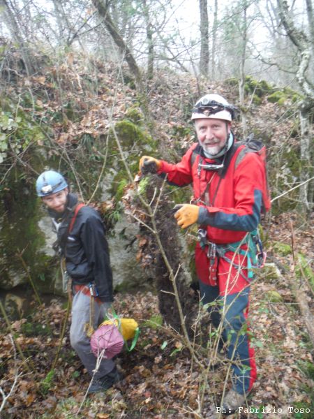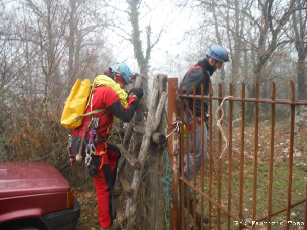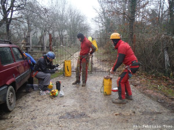 Come il rilievo faceva supporre, la strettoia, fatta in risalita, si rivela un vero DAC (acronimo utilizzato da un mio amico per indicare una cosa fastidiosa come puo’ esserlo un dito messo “alla traditora” dove non si dovrebbe!). Subito dopo la strettoia trovo ad attendermi il buon Gabriele che mi aggiorna circa la situazione. Maurizio, essendo una delle sue prime grotte dopo un piccolo infortunio, ha preferito non proseguire facendo la strettoia. Scelta saggia, penso io dopo averla appena superata. Luca invece ha problemi a casa ed e’ andato via gia’ da un poco, mentre Maurizio e Vincenzone aspettano fuori insieme. Quando arriva Leandro, invito lui e Gabriele ad avviarsi nella risalita. Da questo punto in poi l’aria fredda che viene dall’esterno mal si sposa con la tuta fradicia che abbiamo addosso. Io mi trattengo ancora in attesa di vedere i miei amici disarmanti e per aiutarli a tirare su gli zaini dalla strettoia. Mentre aspetto, tanto per non stare con le mani in mano, disfo l’armo della strettoia e lo rifaccio, sempre su armo naturale, pero’ piu’ in alto. Magari sara’ utile. Faccio quindi quel che mi ero riproposto, ovvero tiro su gli zaini quando arrivano i miei amici. Dopo, piu’ bagnato che mai e seriamente infreddolito mi avvio per uscire. Con disappunto trovo ancora Gabriele in attesa di salire. Con poco garbo gli chiedo come mai. “Leandro doveva finire il suo spuntino” e’ la sua disarmante risposta. Nel frattempo da sopra arriva la “libera” da Leandro. Oramai sento proprio freddo quindi chiedo a Gabriele di poter risalire subito. Ricevuto il suo assenso, parto. Dopo qualche pedalata gia’ mi sento meglio. All’andata avevo sistemato un deviatore posticcio per evitare troppi sfregamenti della corda in salita. A Leandro si e’ tolto ed ha portato tutto via. Per fortuna la corda non sembra soffrirne piu’ di tanto. L’ultimo metro del pozzo di uscita e’ un altro DAC, riesco anche ad infilare il cordino del pedale dentro il croll. Sono quasi con la testa fuori ma ad un punto morto, devo cambiare tattica. Mentre mi appresto a girarmi sento la voce di Vincenzone borbottare in un sussurro: “ma te devi gira’!”. Magari lo dicevi prima! In effetti una volta girato ho piu’ spazio per muovere le gambe e l’uscita e’ piu’ semplice. Appena fuori ricevo il saluto “sigaroso” di Maurizio e la stretta di mano di Leandro che prende commiato per tornare a casa. Dopo di me escono anche Vins e Giuseppe, si vede che Gabriele non soffre piu’ di tanto il venticello freddo che arriva alla base del pozzo. Quando Gabriele risale cerco di evitargli la fatica che ho fatto io avvertendolo per tempo di girarsi per fare l’ultimo tratto. Come sempre non mi ascolta e termina per incastrarsi a tappo nell’ultimo metro. Tanto per completare l’infausta situazione, all’ennesimo sforzo inconsulto, il suo pedale di fettuccia si strappa. Provo a passargli la mia maniglia e pedale ma oramai e’ troppo incastrato per poterli usare. Alla fine Giuseppe ed io risolviamo mettendo una carrucola sull’attacco piu’ alto, prendendo un’altra corda ed usando il tutto per stapparlo di forza. Tutto e’ bene quel che finisce bene si e’ soliti dire! Una volta riuniti scendiamo assieme alle macchine dove potremo cambiarci. Il proprietario del capannone e dello spiazzo dove ci cambiamo ci tiene compagnia con i suoi simpatici cuccioli di cane, assetati di coccole. E’ proprio lui che ci avverte che oggi abbiamo causato scompiglio tra gli abitanti della via privata che porta allo spiazzo di stamane. Sembra che alcuni abitanti si siano parecchio agitati al nostro passaggio. Prendiamo nota della cosa promettendo che la prossima volta saremo piu’ accorti e cercheremo di avvertire prima. Una volta cambiati con abiti asciutti e caldi non ci rimane altro che salutare il nostro ospite e prendere la strada per Carpineto centro dove ci attendono le fettuccine dellla “Sbirra”! Al parcheggio fermo tutti per una foto ricordo.