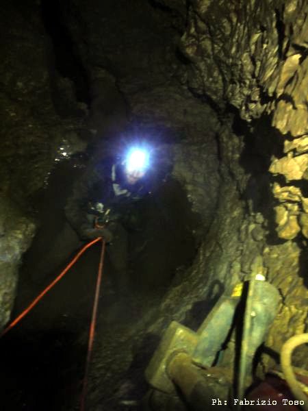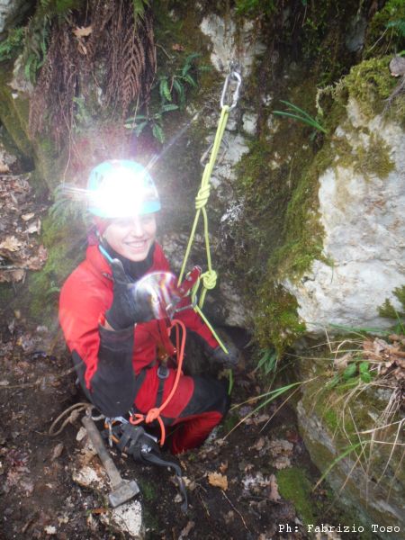Alla partenza del pozzo ci sono alcuni fix, uno ribattuto, uno con la filettatura spanata (che ribatto io) ed una piastrina vergognosamente arrugginita. Alla fine decido per un nuovo fix da utilizzare in congiunzione con la piastrina vergognosa. Nel prendere l’attacco che mi serve, riesco a perderne uno, mi cade di mano. Lui cade nella pozza d’acqua alla base del pozzo, limacciosa e profonda. Non lo troveremo mai. Spunto mentalmente di segnalare a Gabriele la grave perdita. Sistemata la corda facciamo provare a Leandro il brivido della discesa per primo in un posto ancora sconosciuto.