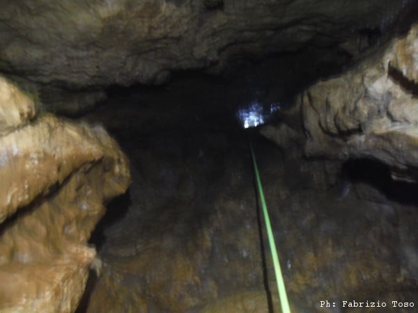 Intanto scende Giuseppe. Quando arriva urliamo di sospendere un attimo le discese, risalgo il pozzo per sistemare un deviatore con il cordino che Giuseppe ha portato con se’. Fatto quel che potevo, scendo di nuovo giu’.