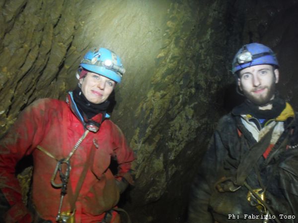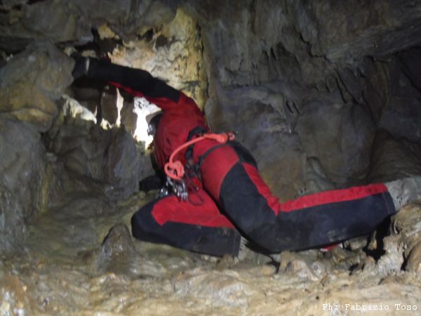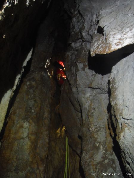 La grotta ed il rilievo non sembrano andare molto d’accordo. Dalla base del pozzo si deve scendere ancora alcuni metri in una stretta spaccatura. Arrivati al fondo della suddetta, si risale tra massi incastrati fino a vedere, finalmente, la partenza del P37. Il primo tratto da dove siamo ora si potrebbe anche scendere fino in fondo utilizzando la corda che viene dall’alto, pero’ decidiamo di mettere almeno un deviatore per evitare sfregamenti indesiderati.