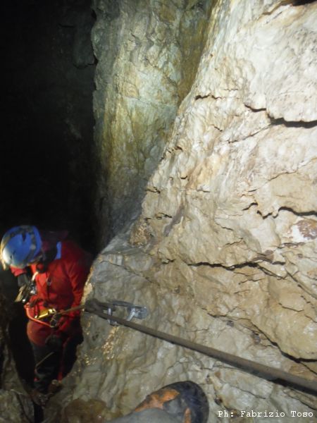 Arrivano i miei amici con il resto del materiale, mi passano la 100, possiamo armare il breve pozzo poco piu’ avanti.